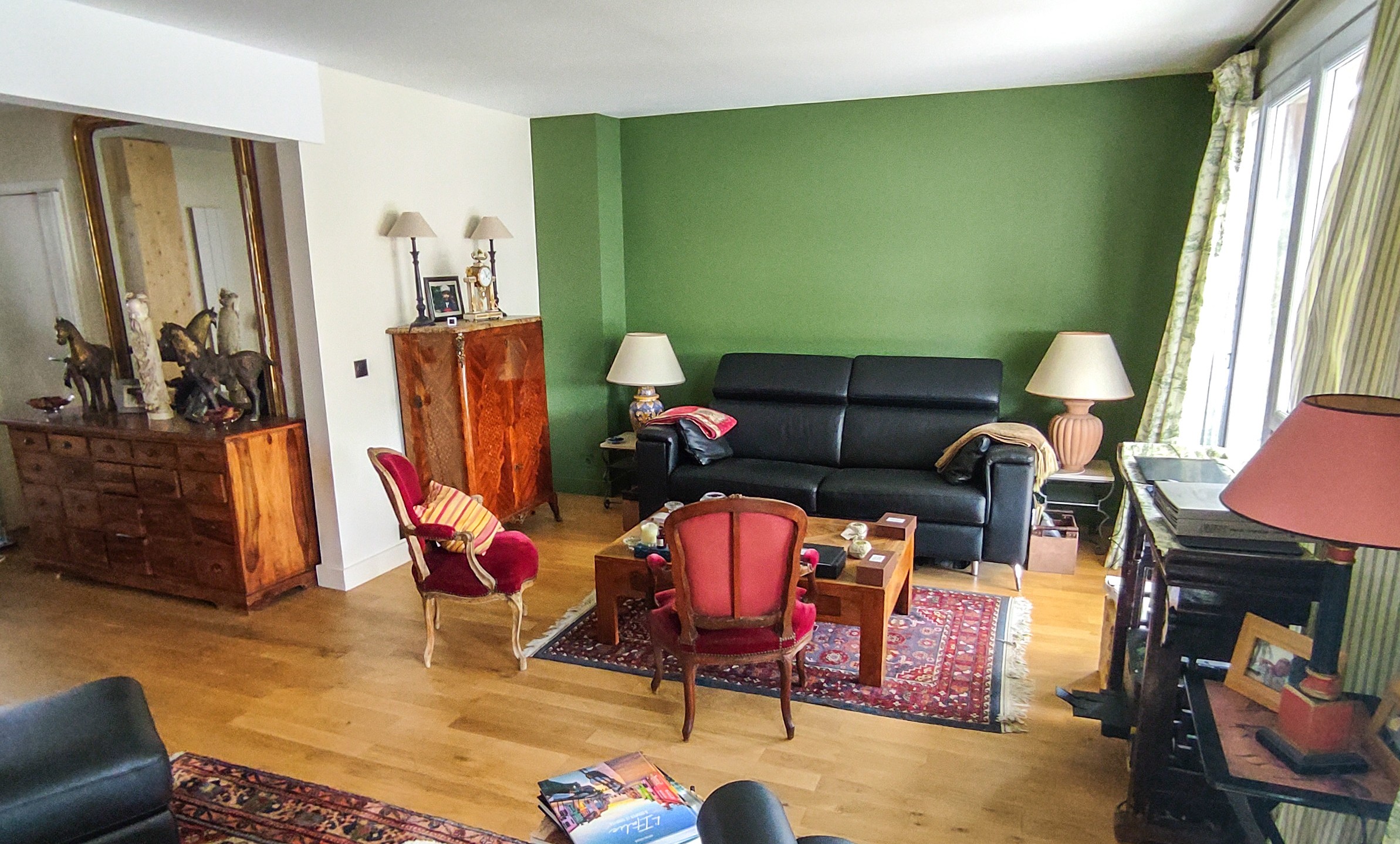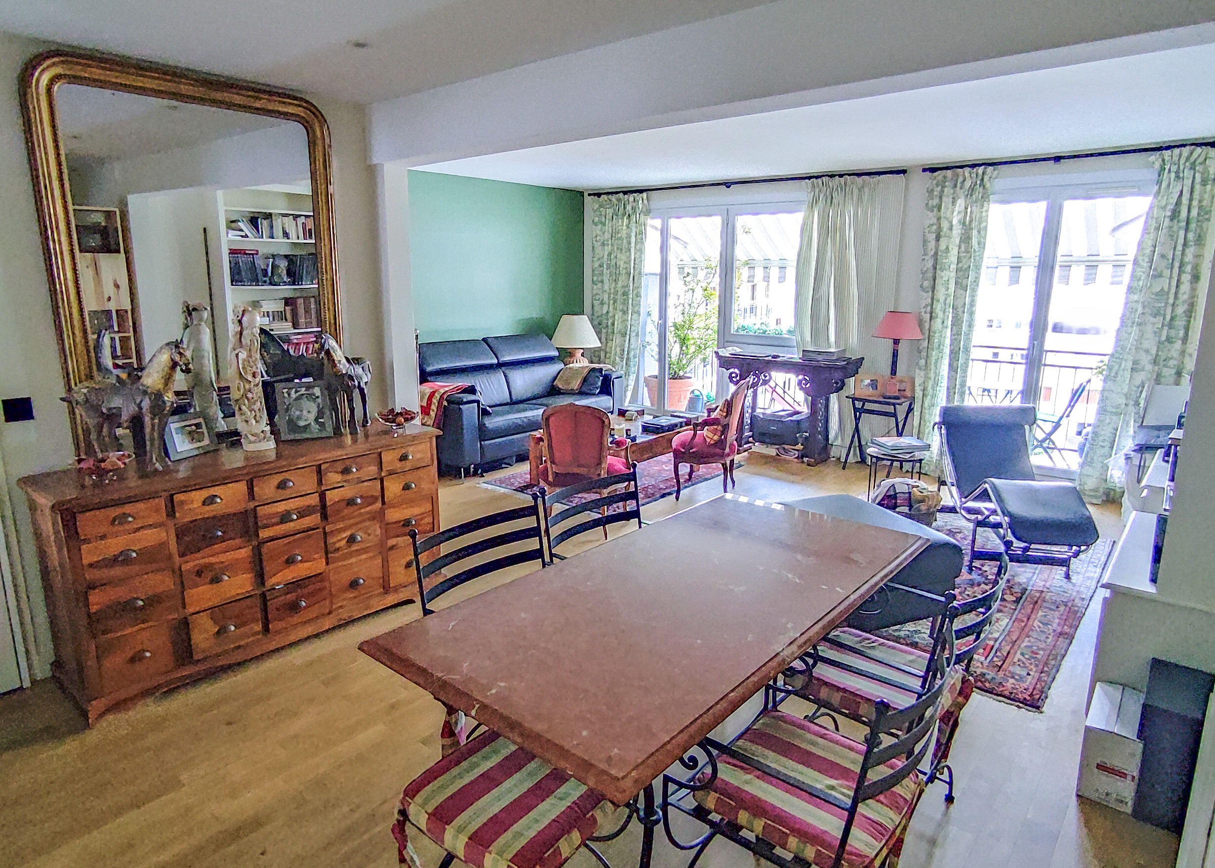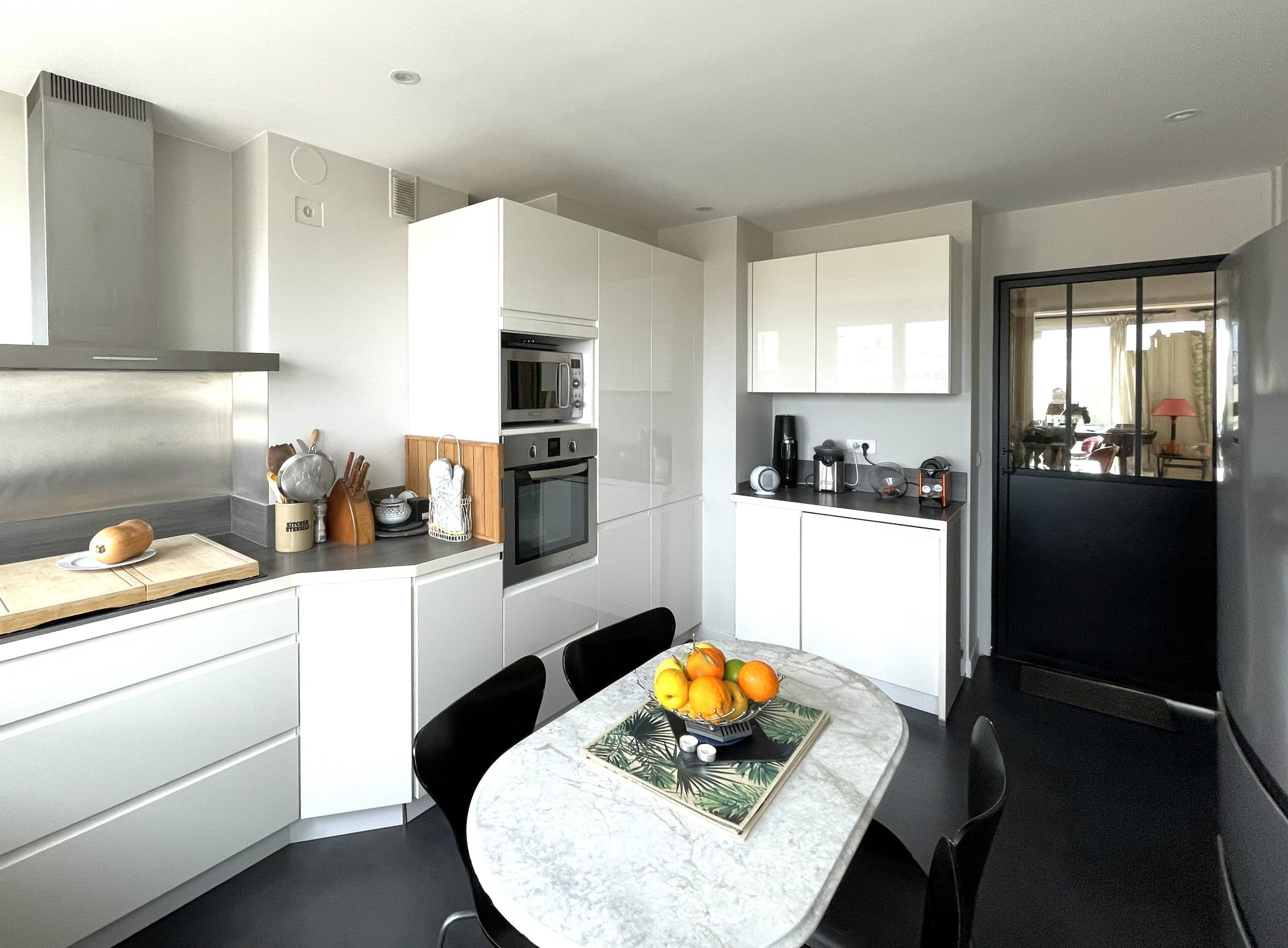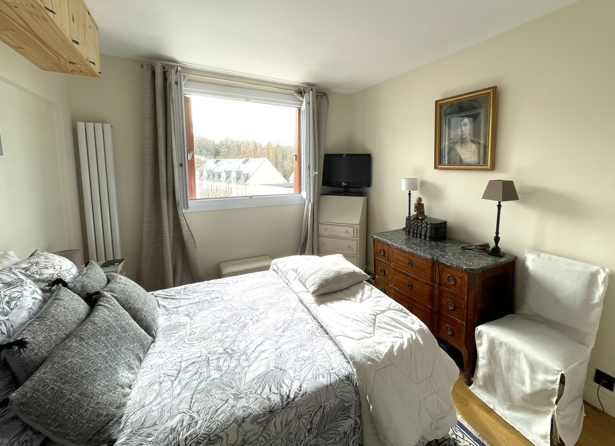 Dans le quartier en pleine évolution de Versailles Chantiers, cadre agréable, bien desservi et proche de la nature, avec les avantages d’une grande ville historique (à dix minutes à pied de la gare et à proximité immédiate des commerces, des écoles et de l’accès direct et privé à la forêt domaniale de Versailles), se trouve ce bel appartement traversant de 93,35 m² Carrez, entièrement rénové avec soin. Situé au cinquième étage d’un immeuble entretenu, desservi par un ascenseur, il offre une luminosité exceptionnelle et des volumes généreux, agrémenté d’une décoration soignée et contemporaine.